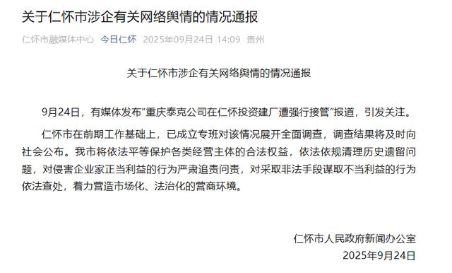 9月24日下午2:09,仁怀市政府新闻办公室发布情况通报称,仁怀市在前期工作基础上,已成立专班对该情况展开全面调查,调查结果将及时向社会公布。
